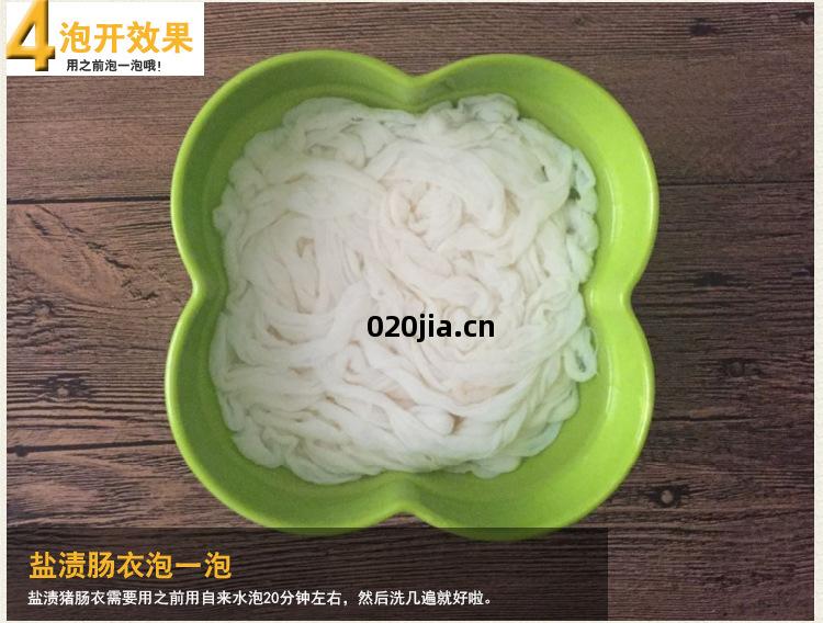 1.鹽(yan)漬豬(zhu)腸(chang)衣(yi)用冷(leng)水(shui)(冬(dong)天可(ke)用溫水(shui))浸泡半小(xiao)時(shi),再(zai)用清水(shui)反復(fu)多沖(chong)洗幾(ji)遍,就(jiu)可(ke)使用(直到(dao)沒有(you)鹽(yan)味(wei)為止(zhi),將(jiang)鹽(yan)洗凈(jing)腸(chang)衣有(you)韌性(xing),不(bu)易破)。